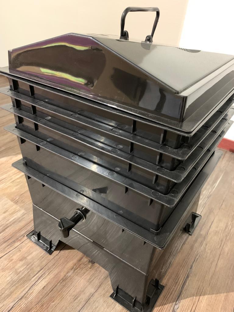 Een wormenbak een bak waarin wormen leven die groente en fruit afval omzetten in een waardevolle bodemverbeteraar. Per dag eten ze hun eigen lichaamsgewicht, 2kg wormen eten 2kg GFT afval per dag en zo slinkt het volume met 80%. Het duurt dus wel even voordat de bak vol zit.